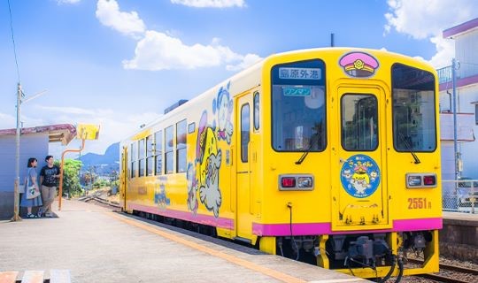 於最接近海岸的大三東站搭乘行駛超過百年的島原列車,月台後就是遼闊海景,還可看到旅人將心願寫在黃色手帕掛於月台,與無敵海景相映成輝,成為日本 IG 上熱門的「幸福」象徵。時而在田園中奔馳、時而沿海而行,追風前進,景色多變,於愛野車站下車。